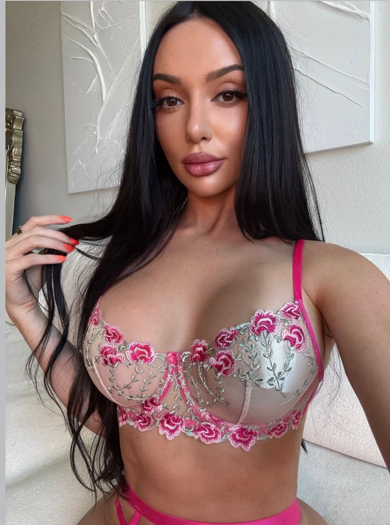 Our beautiful midnight bloom set includes Bra, Thong, Garter, attachable leg straps and matching gloves.